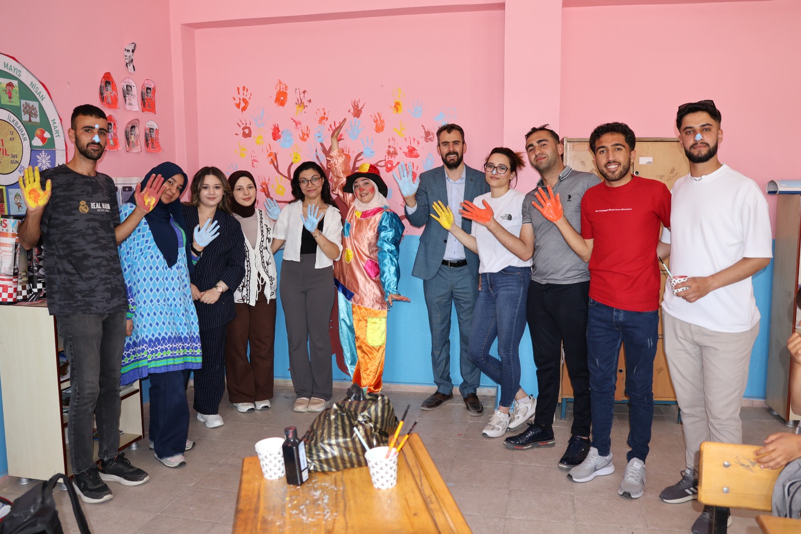Faaliyeti eğlenceli hale dönüştürmek için yapılan palyaço gösterisi, çocuklar için cazip bir eğlence oluyor. El boyama ve yüz boyama etkinliği de faaliyetlere neşe katılıyor.