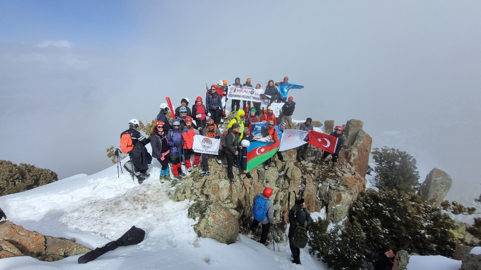 IĞDIR (ERYA) - 26 ŞUBAT 2024 - Hocalı soykırımında katledilen şehit Türklerin anısına, Türk dağcıları tarafından Nahçıvan'da ki Haça Dağı'na zirve tırmanışı gerçekleştirildi. Azerbaycan'da ermeniler tarafından 26 Şubat 1992 tarihinde 613 kişi katledilerek öldürüldü. Azerbaycan Kars Başkonsolosluğu, Iğdır Gençlik ve Spor İl Müdürlüğü, Nahçıvan Gençlik ve Spor Bakanlığı, Türkiye Azerbaycan Derneği (TÜRKAZDER), Iğdır Kamp ve Doğa Yürüyüşü Spor Kulübü, Gönül Elçileri Arama Kurtarma Derneği (GEAK) ve Iğdırlı dağcılarca düzenlenen programda, Türkiye’nin farklı bölgelerinden gelen dağcılar da programa dahil oldular. Programa, Azerbaycan'dan gelen 5 dağcı ve Nahçıvan Olağanüstü Haller Bakanlığı ile İçişleri Bakanlığı ekipleri de eşlik ettiler. Tırmanış, Hocalı'da yapılan katliamın 32. yılı olması münasebetiyle 32 dağcı tarafından gerçekleştirildi.
