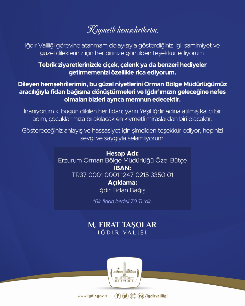 Çankırı Valisi iken Iğdır Valiliği görevine atanan M. Fırat Taşolar, yayımladığı mesajda tebrik ziyaretlerinde çiçek, çelenk veya benzeri hediyeler getirilmemesini özellikle rica etti. Taşolar, bu güzel niyetlerin Orman Bölge Müdürlüğü aracılığıyla fidan bağışına dönüştürülmesinin kendilerini ayrıca memnun edeceğini ifade etti. Açıklamada IBAN bilgisine de yer veren Taşolar şu ifadeleri kullandı: "Kıymetli hemşehrilerim, Iğdır Valiliği görevine atanmam dolayısıyla gösterdiğiniz ilgi, samimiyet ve güzel dilekleriniz için her birinize gönülden teşekkür ediyorum. Tebrik ziyaretlerinizde çiçek, çelenk ya da benzeri hediyeler getirmemenizi özellikle rica ediyorum. Dileyen hemşehrilerimin, bu güzel niyetlerini Orman Bölge Müdürlüğümüz aracılığıyla fidan bağışına dönüştürmeleri ve Iğdır’ımızın geleceğine nefes olmaları bizleri ayrıca memnun edecektir. İnanıyorum ki bugün dikilen her fidan; yarın Yeşil Iğdır adına atılmış kalıcı bir adım, çocuklarımıza bırakılacak en kıymetli miraslardan biri olacaktır. Göstereceğiniz anlayış ve hassasiyet için şimdiden teşekkür ediyor, hepinizi sevgi ve saygıyla selamlıyorum.